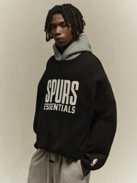 The Spurs Essentials hoodie is crafted from core fleece and features a voluminous, cropped silhouette. The front displays a rubberized soft-touch Spurs Essentials lockup along with the iconic NBA logo on the sleeve. Additional details include a contrasting double layered hood, side seam pockets, and elastic bindings at the cuffs and waist hem. A rubberized Fear of God label is attached to the hood. DETAILS - 80% cotton / 20% polyester heavyweight fleece - Essentials modern fit - cropped, voluminous body, sleeves - Rubberized soft-touch SPURS ESSENTIALS graphic and NBA logo - Fear of God rubberized label on the hood - Side seam pockets - Contrasting double layered hood - Elastic Binding at cuff and tapered waistband - Imported