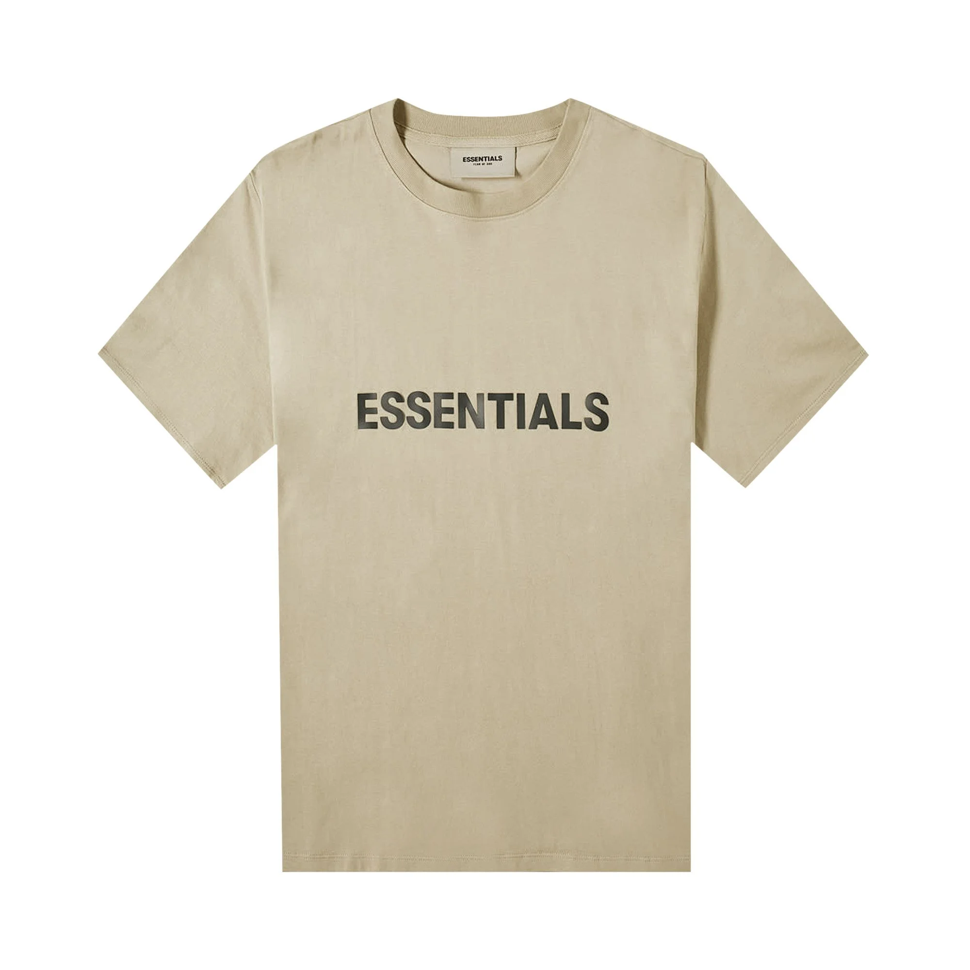 From Fear of God Essentials' FW20 collection, the FOG Essentials T-Shirt 'Olive' features a tan hue, with a large "Essentials" logo emblazoned across the chest in black. The wordmark reappears on a small rubberized patch on the back of the neck.