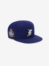 The Fear of God Essentials Los Angeles Dodgers 59FIFTY Fitted Cap features an embroidered Fear of God script logo at the front, 2024 World Series patch on the side, and a Fear of God label at the back. Additional details include a Dodgers team color fabrication with a grey undervisor. DETAILS - FULLY FITTED 59FIFTY CAP - CONTRASTING GREY UNDERVISOR - EMBROIDERED F SCRIPT LOGO ON FRONT - EMBROIDERED 2024 WORLD SERIES PATCH - EMBROIDERED NEW ERA SCRIPT LOGO ON SIDE - FEAR OF GOD LABEL AT BACK - 100% WOOL - IMPORTED
