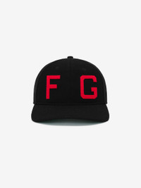 The Fear of God Essentials FG Monarchs 9FORTY adjustable cap features the Kansas City Monarchs color fabrication with a felt FG logo at the front panels and a Fear of God label on the adjustable strap at the rear. DETAILS - FULLY FITTED 9FORTY CAP - CONTRASTING GREEN UNDERVISOR - FELT FG LOGO ON FRONT - EMBROIDERED NEW ERA SCRIPT LOGO ON SIDE - FEAR OF GOD LABEL AT BACK - 100% WOOL - IMPORTED