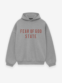 The Essentials Fleece Hoodie has been upgraded in a heavier 480gsm core fleece to provide additional body and structure. A collegiate-inspired "Fear of God State" graphic is screen printed on the front. Details include an overlapped neckline hoodie, rib-knit cuffs, waist-hem, and side pockets. The Essentials Fear of God rubberized label is at the back collar. DETAILS - 80% cotton / 20% polyester fleece, 480GSM - Essentials fit - relaxed body, sleeves - "Fear of God State" screen print logo - Overlapped neckline hoodie - Rib-knit cuffs, and waist hem - Side Pockets - Essentials Fear of God rubberized label - Imported