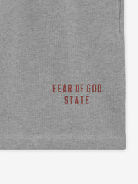The Essentials Fleece Soccer Short is updated in a heavy 480gsm core fleece to provide additional body and structure. A collegiate-inspired "Fear of God State" graphic is screen printed on the leg. Additional details include an encased elastic waistband with elongated drawstrings, and side seam pockets. The Essentials Fear of God rubberized label is at the center front. DETAILS - 80% cotton / 20% polyester fleece, 480GSM - Essentials fit – relaxed leg and seat - "Fear of God State" screen print - Encased elastic waistband - Heavyweight drawstring with rubberized tip - Side seam pockets - Essentials Fear of God rubberized label - Imported