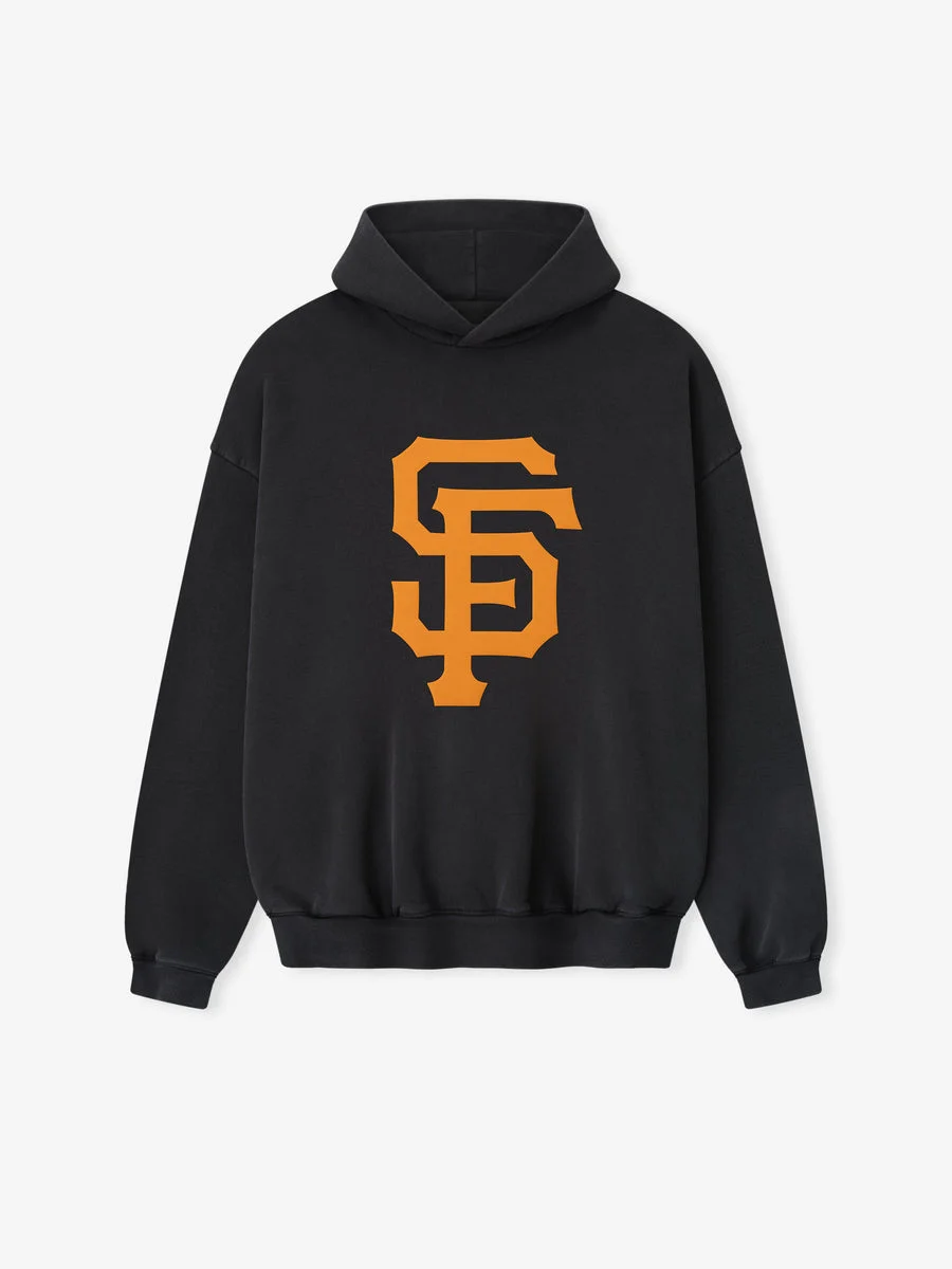 The Giants Sport Hoodie is crafted from pigment-dyed, heavyweight 520gsm cotton fleece, delivering a faded vintage feel and a sense of sports nostalgia. Designed in a relaxed Sport fit, the front features the iconic San Francisco Giants logo in a HD print, while the back showcases an San Francisco Essentials script lockup. Additional details include a MLB logo on the sleeve, side pockets, and rib-knit cuffs and waist hem. The look is finished with the signature rubberized Fear of God Essentials label at the hood. DETAILS - 100% COTTON 520GSM PIGMENT-DYED FLEECE - ESSENTIALS SPORT RELAXED FIT - SAN FRANCISCO ESSENTIALS LOCKUP - SAN FRANCISCO GIANTS LOGO - MLB LOGO - FEAR OF GOD ESSENTIALS LABEL - SIDE POCKETS - RIB KNIT BINDING AT CUFF AND WAIST HEM - IMPORTED
