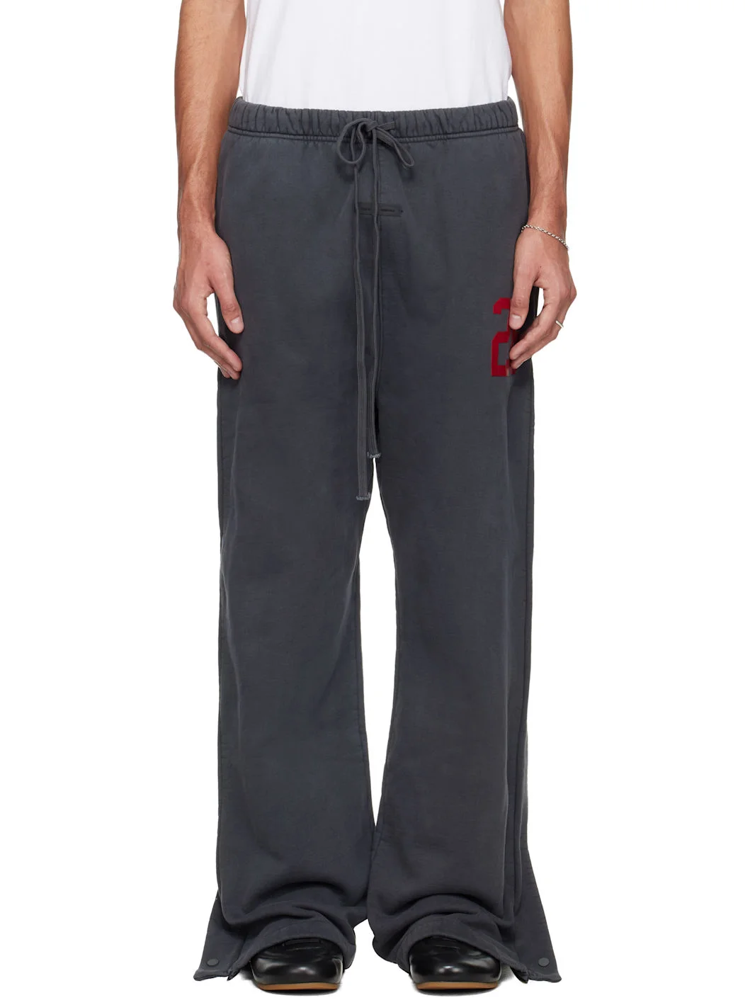 Heavyweight cotton fleece sweatpants. · Fading throughout · Wide-leg · Drawstring at elasticized waistband · Two-pocket styling · Rubber logo patch at front · Text bonded at leg · Zip vent and press-stud placket at outseams Part of the Fear of God ESSENTIALS Holiday collection. Supplier color: Iron grey 100% cotton. Made in Viet Nam 261161M190004