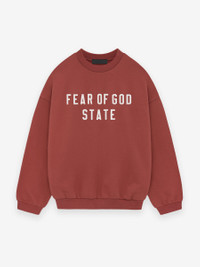 The Heavy Fleece Crewneck is made from heavyweight 520gsm, 100% cotton fleece with a subtle vintage wash. The designed volume creates a round, cropped silhouette. A collegiate-inspired "Fear of God State" satin twill varsity lettering is stitched across the front. Details include a rib-knit collar, cuffs, waist-hem, and side pockets. The Essentials Fear of God rubberized label is at the back collar. DETAILS - 100% cotton fleece, 520GSM - Essentials fit - relaxed body, sleeves - Vintage Wash - "Fear of God State" satin twill lettering - Rib-knit collar, cuffs, and waist hem - Side Pockets - Essentials Fear of God rubberized label - Imported