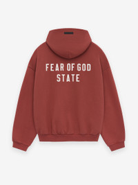 The Heavy Fleece Fullzip Hoodie is made from heavyweight 520gsm, 100% cotton fleece with a subtle vintage wash. A collegiate-inspired "Fear of God State" satin twill lettering is stitched to the across the back. Details include an full-zip front, overlapped neckline hoodie, rib-knit cuffs, waist-hem, and side pockets. The Essentials Fear of God rubberized label is stitched on the hood. DETAILS - 100% cotton fleece, 520GSM - Essentials fit - relaxed body, sleeves - Vintage Wash - "Fear of God State" screen print - Hoodie - Full-zip front - Rib-knit cuffs, and waist hem - Side Pockets - Essentials Fear of God rubberized label - Imported