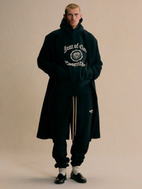 The Heavy Fleece Vintage Shrunken Hoodie is made from heavyweight 520gsm, 100% cotton fleece with a subtle vintage wash. The silhouette is influenced by shrunken fit of the 1980's. An Old English "Fear of God University" with shield graphic is printed on the chest. Details include an double layer hoodie, rib-knit cuffs, waist-hem, and side pockets. The Essentials Fear of God rubberized label on the collar. DETAILS - 100% cotton fleece, 520GSM - 80's shrunken fit - Vintage Wash - "Fear of God University" with shield graphic screen print - Double Layer hoodie - Rib-knit cuffs, and waist hem - Side Pockets - Essentials Fear of God rubberized label - Imported
