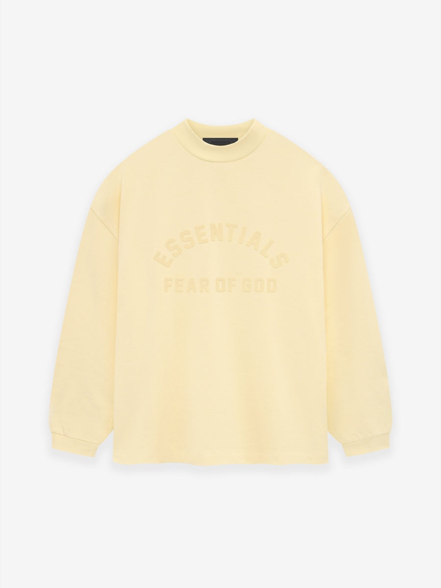 The Essentials long sleeve T-shirt is elevated in a 380-gram heavy cotton jersey to provide additional weight and structure. The rib-knit crewneck fits relaxed in the body with dropped shoulders. A collegiate-inspired Essentials Fear of God logo on the center front is made modern in a rubberized soft-touch texture. A Fear of God rubberized label is at the back collar. DETAILS - 100% cotton heavy jersey, 380-gram - Essentials fit - relaxed body and sleeves - Classic rib-knit collar and cuffs - Essentials Fear of God soft-touch rubberized logo - Fear of God rubberized label - Imported