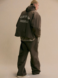 The Textured Nylon Hooded Coaches Jacket is made from heavy crinkle nylon for bold structure and full perforated poly lining for comfort. A sports-inspired "Fear of God Essentials" satin twill lettering is stitched across the back. The boxy, cropped hoodie style has a rubberized snap front, side pockets, elastic cuffs, and waist hem with drawstring. The Essentials Fear of God black bar is stitched on the sleeve. DETAILS - 100% recycled nylon - 100% polyester perforated lining - "Fear of God Essentials" satin twill lettering - Short, boxy fit - Full front rubber snaps - Side pockets - Drawstring waist - Elastic hem cuffs - Essentials Fear of God rubberized label - Imported