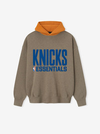 The Knicks Sport Hoodie is crafted from core fleece, offering an elevated balance of softness, structure, and lasting comfort. Cut in a relaxed sport fit, it drapes with more ease through the body and extended length compared to the Essentials classic silhouette. The front features a bold puffer-print graphic "Knicks Essentials " alongside the authentic NBA logo, while the back showcases the "New York" logo. Additional features include contrasting hood, side pockets, rib-knit at the cuffs and waist hem. The signature rubberized Fear of God Essentials label accents the hood. DETAILS - 80% COTTON / 20%POLYESTER FLEECE - ESSENTIALS SPORT FIT: RELAXED, CROPPED - KNICKS ESSENTIALS LOCKUP - NBA LOGO - NEW YORK LOGO - FEAR OF GOD LABEL - SIDE POCKETS - ELASTIC BINDING AT CUFF AND WAIST HEM - IMPORTED