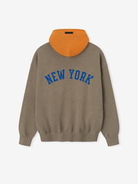 The Knicks Sport Hoodie is crafted from core fleece, offering an elevated balance of softness, structure, and lasting comfort. Cut in a relaxed sport fit, it drapes with more ease through the body and extended length compared to the Essentials classic silhouette. The front features a bold puff-print graphic "Knicks Essentials" alongside the authentic NBA logo, while the back showcases the "New York" logo. Additional features include contrasting hood, side pockets, rib-knit at the cuffs and waist hem. The signature rubberized Fear of God Essentials label accents the hood. DETAILS - 80% COTTON / 20%POLYESTER FLEECE - ESSENTIALS SPORT FIT: RELAXED, CROPPED - KNICKS ESSENTIALS LOCKUP - NBA LOGO - NEW YORK LOGO - FEAR OF GOD LABEL - SIDE POCKETS - ELASTIC BINDING AT CUFF AND WAIST HEM - IMPORTED