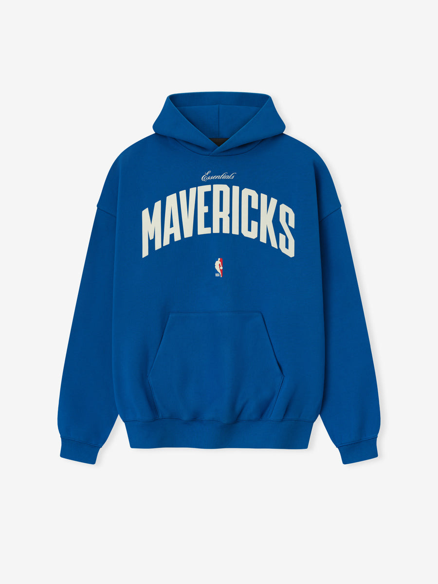 The Mavericks 90s Sport Hoodie is crafted from core fleece, offering an elevated balance of softness, structure, and lasting comfort. Cut in a relaxed sport fit, it drapes with more ease through the body and extended length compared to the Essentials classic silhouette. The front features a bold puff-print graphic "Essentials Mavericks " alongside the authentic NBA logo. Additional features a kangaroo pocket, rib-knit at the cuffs and waist hem. The signature rubberized Fear of God Essentials label accents the hood. DETAILS - 80% COTTON / 20%POLYESTER FLEECE - ESSENTIALS SPORT FIT: RELAXED - ESSENTIALS MAVERICKS LOCKUP - NBA LOGO - FEAR OF GOD LABEL - KANGAROO POCKET - ELASTIC BINDING AT CUFF AND WAIST HEM - IMPORTED