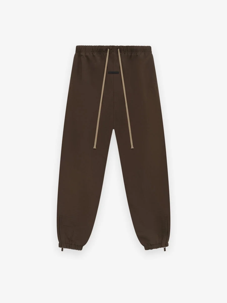 The Military Nylon Trackpant is constructed in nylon-viscose with a full perforated poly lining for comfort. Details include an elastic waistband, elongated drawstring, side pockets, and elastic ankle hems with adjustable zippers. Minimalist branding is showcased with the Essentials Fear of God black bar at the center front. DETAILS - 38% recycled nylon, 38% recycled viscose, 24% nylon - 100% polyester perforated lining - Essentials relaxed fit - Encased elastic waistband - Heavyweight drawstring with rubberized tip - Side pockets - Elastic ankle hem with zipper - Essentials Fear of God rubberized label - Imported