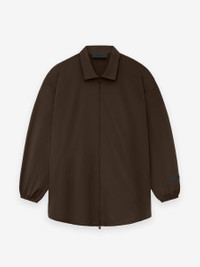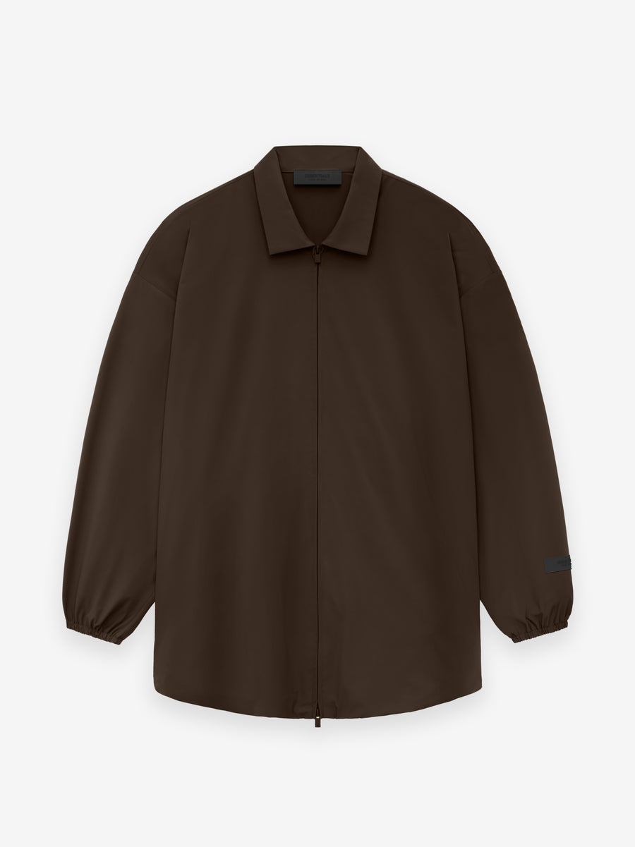 The Essentials overshirt is made in a stretch woven nylon with a relaxed fit. The piece is designed to be styled as a shirt or jacket. Details include a shirt collar, side seam zipper pockets, and elastic hem at cuffs. A Fear of God rubberized label is at the back collar. DETAILS - Woven Nylon: 86% Nylon/ 14% Spandex - Essentials fit - relaxed body, sleeves - Shirt collar - Side seam pockets - Fear of God rubberized label at back collar - Imported