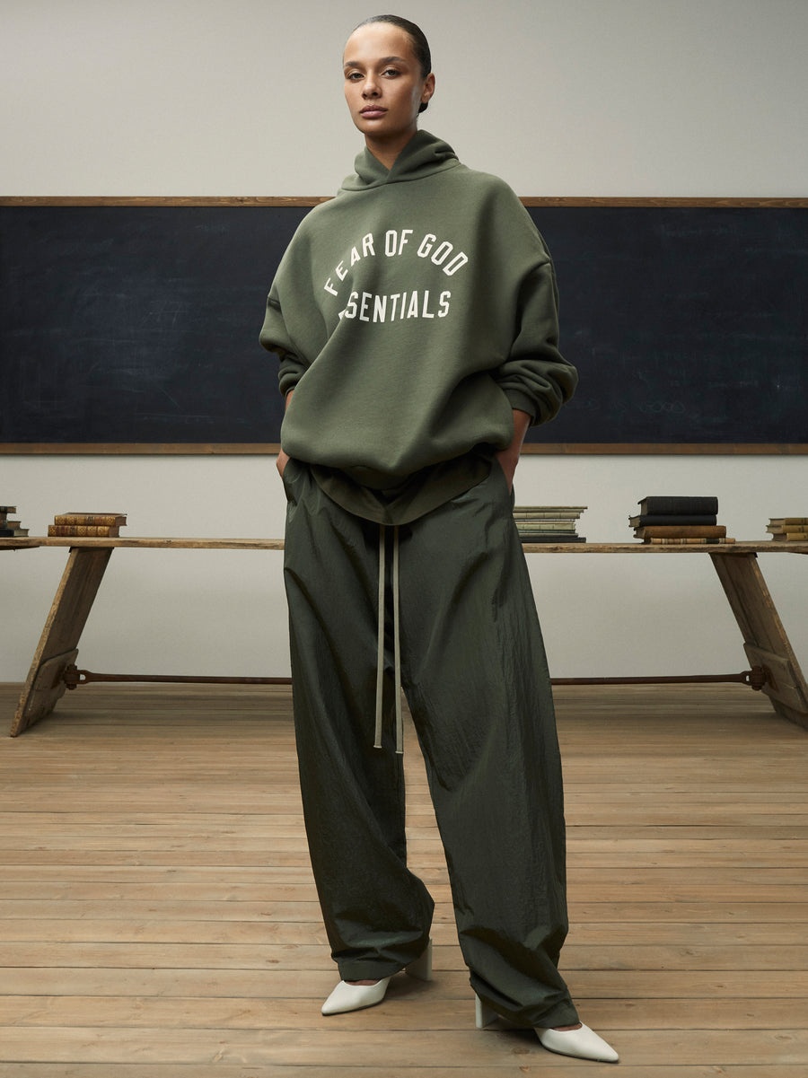 The Ripstop Relaxed Pant is made from nylon ripstop to provide durable texture and water repellant performance. The wide leg fit pant has a perforated poly lining, an encased elastic waistband, elongated drawstring, side pockets, and ankle bungee cord for adjustability. Minimalist branding is seen in the Essentials Fear of God black bar at center front. DETAILS - 100% ripstop nylon - 100% polyester perforated lining - Wide leg fit - Encased elastic waistband - Heavyweight drawstring with rubberized tip - Side pockets - Elastic ankle bungee - Essentials Fear of God rubberized label - Imported