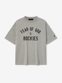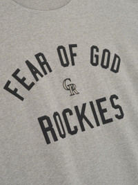 The Rockies 90s Tee is cut from 100% cotton jersey, offering a soft yet substantial hand feel. Designed in an oversized 90s-inspired silhouette, it features exaggerated proportions with dropped shoulders for a relaxed drape. The front is defined by a bold puffer-print application of the "Fear of God Rockies" lockup, alongside the MLB insignia on the sleeve. Across the back, an official Colorado logo anchors the piece with the signature rubberized Fear of God Essentials label at the collar. Fit Note: Size Medium fits like Classic Tee XL. DETAILS - 100% COTTON JERSEY, 220GSM - ESSENTIALS 90s FIT - OVERSIZED BODY AND SLEEVES - FEAR OF GOD ROCKIES GRAPHIC - MLB LOGO - COLORADO LOGO - CLASSIC RIB-KNIT COLLAR - FEAR OF GOD ESSENTIALS RUBBERIZED LABEL AT BACK COLLAR - IMPORTED