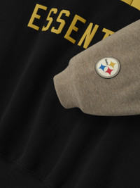 The Steelers Sport Hoodie is crafted from heavy 480gsm core fleece and cut in a relaxed sport fit. The front features a bold "Steelers Essentials" puff-print graphic paired with the official NFL shield logo. Additional features include, contrasting sleeves, side pockets, rib-knit at the cuffs and waist hem. The signature rubberized Fear of God Essentials label accents the hood. DETAILS - 80% COTTON / 20%POLYESTER FLEECE 480GSM - ESSENTIALS SPORT FIT: RELAXED, - STEELERS ESSENTIALS GRAPHIC - NFL SHIELD LOGO - FEAR OF GOD ESSENTIALS LABEL - SIDE POCKETS - RIB KNIT CUFF AND WAIST HEM - IMPORTED