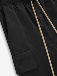 The Textured Nylon Field Pant is made from heavy crinkle nylon for bold structure and full perforated poly lining for comfort. The wide leg fit pant has cargo pockets, encased elastic waistband, elongated drawstring, side pockets, and ankle bungee cord for adjustability. Minimalist branding is seen in the Essentials Fear of God black bar at center front. DETAILS - 100% recycled nylon - 100% polyester perforated lining - Wide leg fit - Cargo pockets - Encased elastic waistband - Heavyweight drawstring with rubberized tip - Side pockets - Elastic ankle bungee - Essentials Fear of God rubberized label - Imported