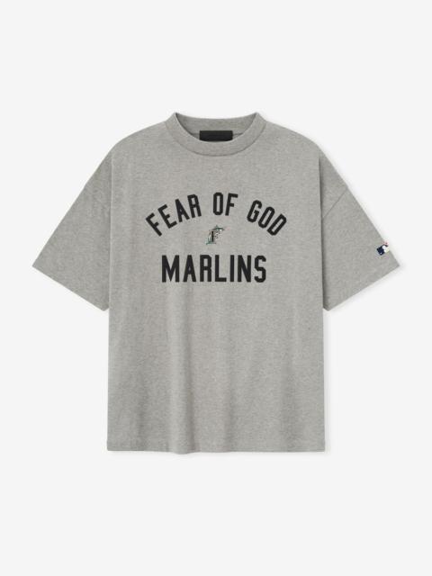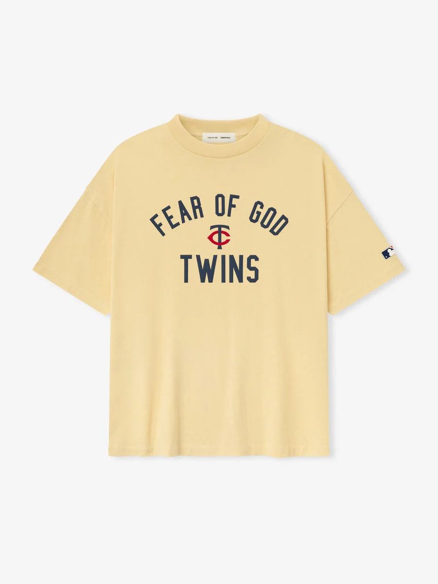 The Twins 90s Tee is cut from 100% cotton jersey, offering a soft yet substantial hand feel. Designed in an oversized 90s-inspired silhouette, it features exaggerated proportions with dropped shoulders for a relaxed drape. The front is defined by a bold puffer-print application of the "Fear of God Twins" lockup, alongside the MLB insignia on the sleeve. Across the back, an official Minnesota logo anchors the piece with the signature rubberized Fear of God Essentials label at the collar. Size Note: size down for a classic fit DETAILS - 100% COTTON JERSEY, 220GSM - ESSENTIALS 90s FIT - OVERSIZED BODY AND SLEEVES - FEAR OF GOD DODGERS GRAPHIC - MLB LOGO - LOS ANGELES LOGO - CLASSIC RIB-KNIT COLLAR - FEAR OF GOD ESSENTIALS RUBBERIZED LABEL AT BACK COLLAR - IMPORTED