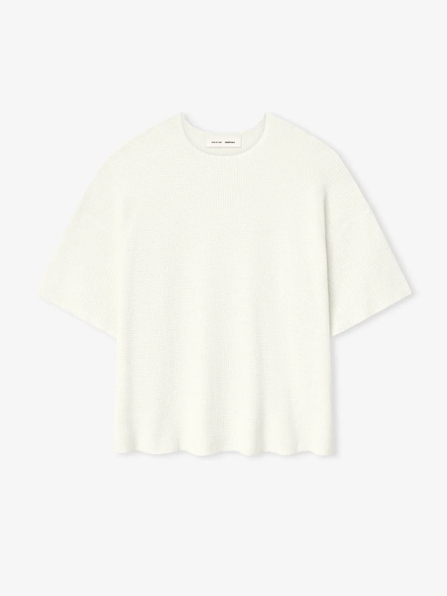 The Waffle Short Sleeve Sweater is made from heavyweight poly-nylon knit for warmth with stretch comfort. The fit is relaxed with drop shoulders. A "Fear of God Essentials" rubberized label is stitched at the back collar. DETAILS - 88% poly, 12% nylon waffle knit - Model is 6'3" and wears size Medium in Homestead Heather - Essentials fit - relaxed body, drop shoulders - "Fear of God Essentials" translucent rubberized label - Imported
