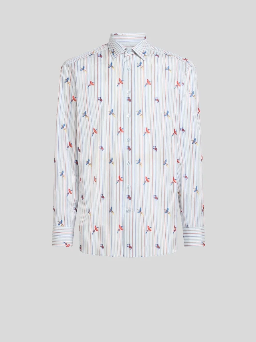 Striped pure cotton jacquard shirt with archive-sourced, tie-style hummingbird and micro Paisley motif. • Roma regular fit • Pointed collar • Button closure • Double-buttoned working cuffs • Made in Italy • The model is 6' 1½" (187 cm) tall and wears a size 39 (IT) PRODUCT DETAILS • 100% cotton