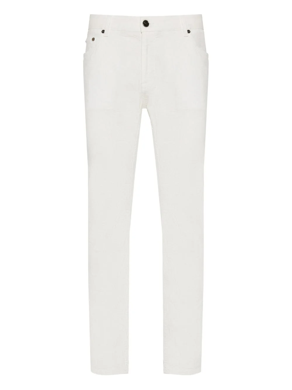 button-up trousers Highlights - White - Textured effect - Belt loops - Five pockets - Button fastening - Back logo patch Imported Composition Fabric 100% Washing instructions Read Manufacturer Guidelines