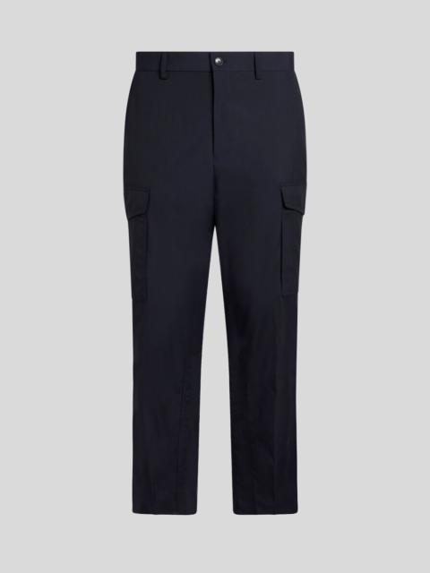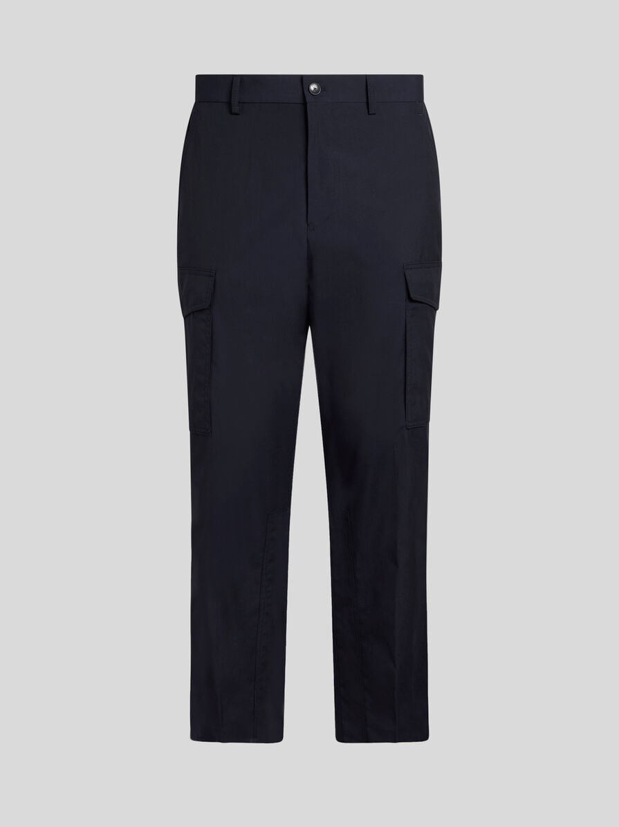 Tapered tailored trousers in a wool and cotton blend. This model is distinguished by the cargo maxi-pockets on the side of the legs. The label with ETRO lettering on the back of the waist complements the piece. • Regular fit • High waist • Concealed zip and button closure • Cargo pockets • Side slip pockets • Rear welt pockets • Made in Italy • The model is 6' 1½" (187 cm) tall and wears a size 48 PRODUCT DETAILS • 70% wool, 30% cotton