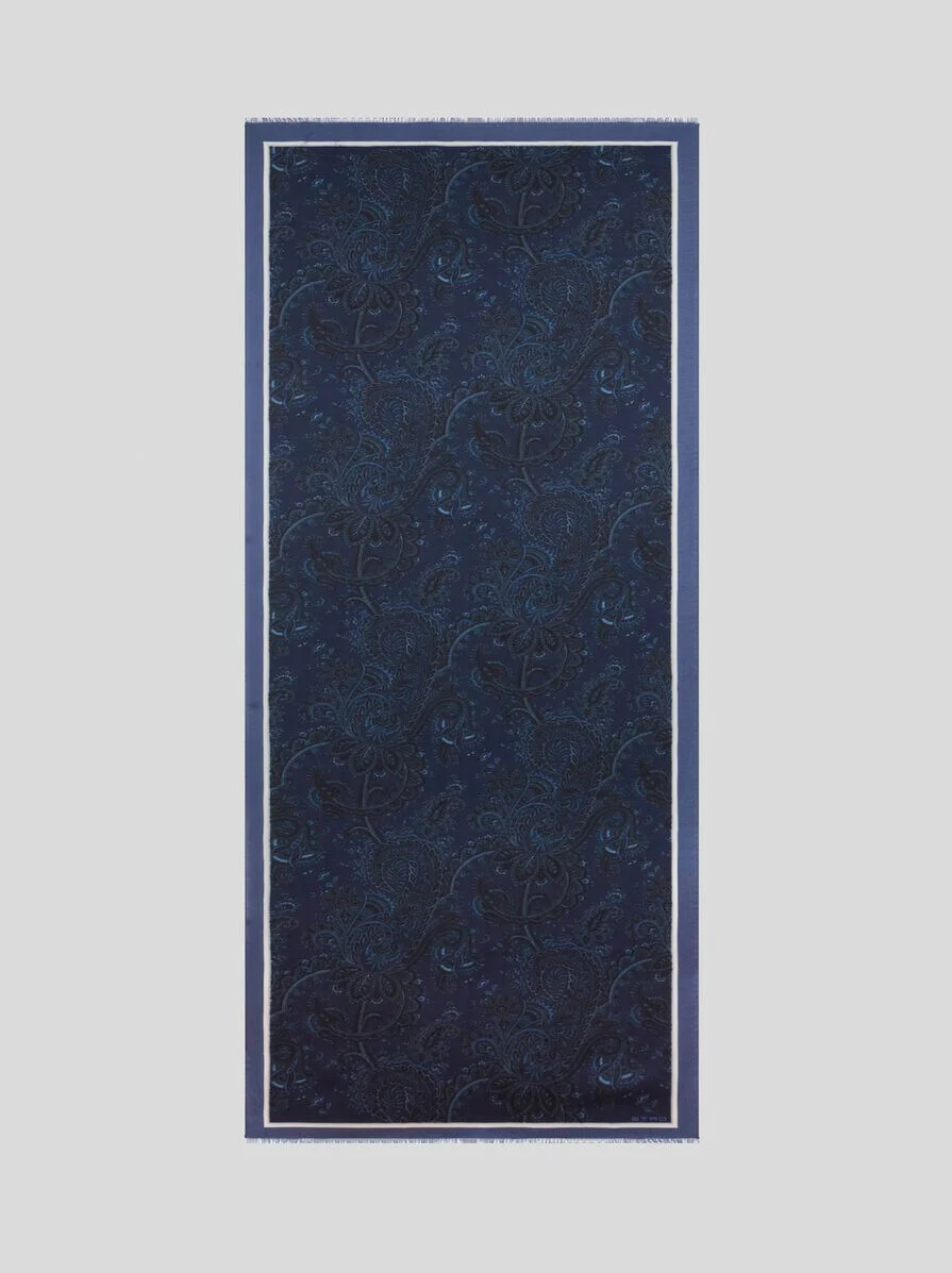 Cashmere- and silk-blend scarf embellished with dense Paisley motif featuring floral-inspired elements. The iconic ETRO logo and slightly frayed short sides complete the accessory. • Size: 27.6 x 78.7 inches (70 x 200 cm) • Made in Italy PRODUCT DETAILS • 70% cashmere, 30% silk
