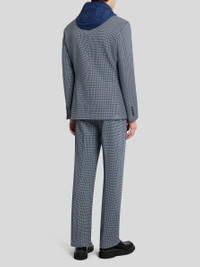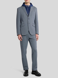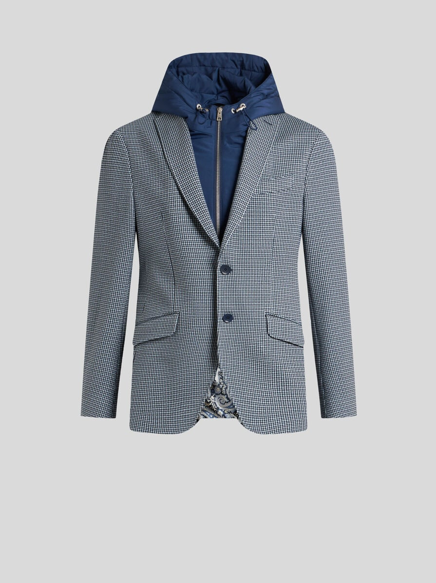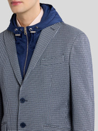 Single-breasted blazer in cotton jacquard fabric with mini check motif all over. This model features a removable nylon bib with a hood and zip. It features a contrasting undercollar and lining with a decorative floral Paisley print. • Roma fit • Classic lapels • Single-breasted closure with branded buttons • Bib • Drawstring hood • Welt breast pocket • Side slip pockets with flap, Cuffs with four buttons • Made in Italy. The model is 6' 1½" (187 cm) tall and wears a size 48 PRODUCT DETAILS • 100% cotton • Hood: 100% polyamide • Bodice lining: 52% viscose, 48% acetate • Sleeve lining: 57% viscose, 43% polyester