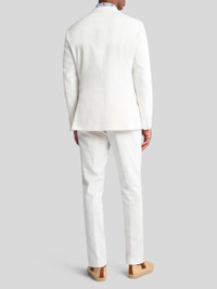 Single-breasted blazer in solid-colour stretch cotton jacquard. This piece features a tonal foliage design on the lining. The contrasting undercollar complements the design. • Roma regular fit • Classic lapels • Single-breasted two-button closure • Welt breast pocket • Front pockets with flap • Cuffs with four buttons • Made in Italy • The model is 6' 1½" (187 cm) tall and wears a size 48 PRODUCT DETAILS • 98% cotton, 2% elastane • Bodice lining: 100% viscose • Sleeve lining: 52% viscose, 48% acetate