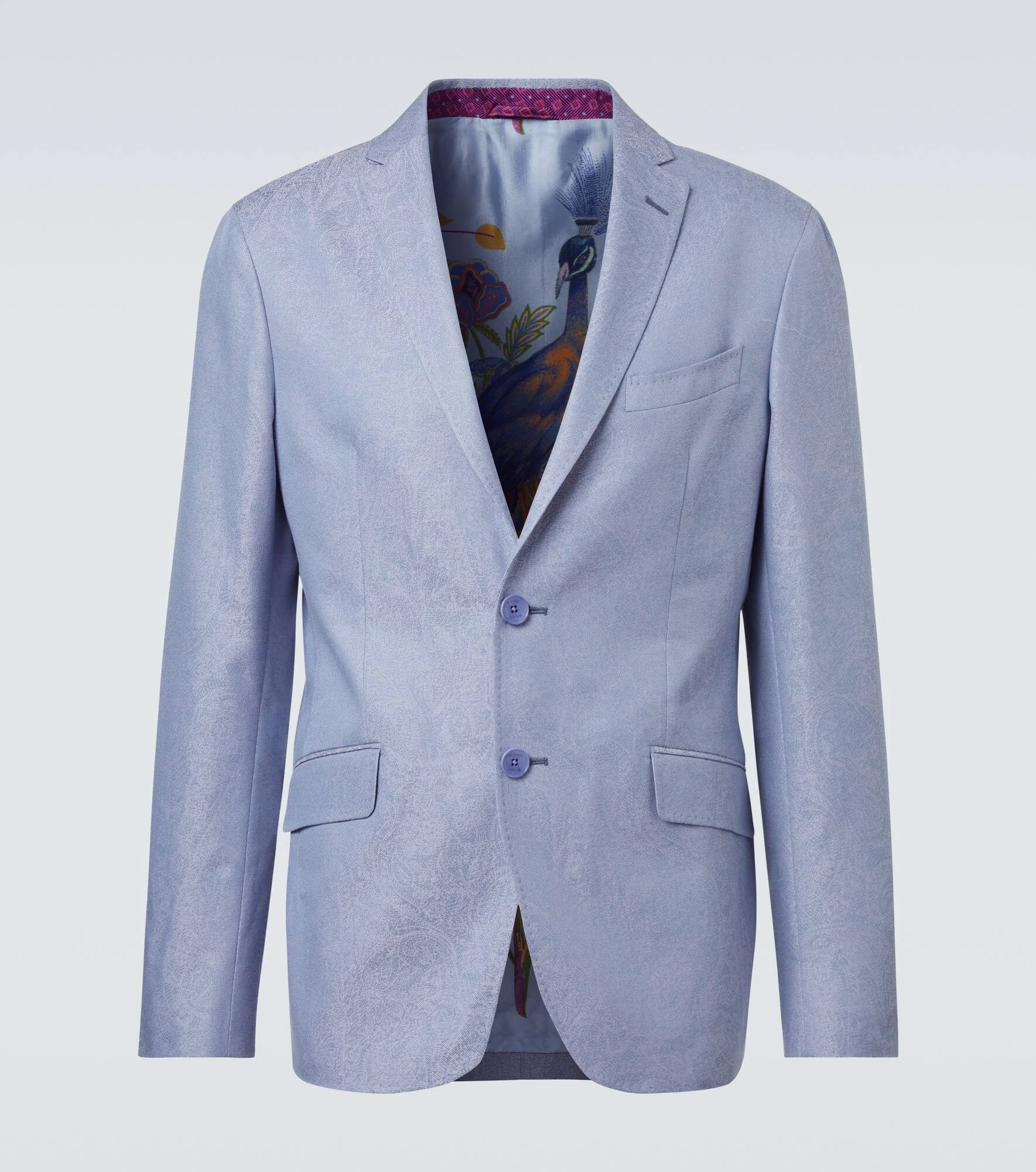 Crafted in Italy from cotton jacquard, this single-breasted blazer from Etro reveals a floral-inspired print lining. The sophisticated design is finished with timeless notched lapels and classic flap pockets. Product Details - Material: 100% cotton - Care instructions: dry clean - Made in Italy - Designer color name: Light Blue - Item color: blue - Lining: 100% viscose - Sleeve lining: 50% viscose, 50% acetate - Notched lapel - Closure: buttoned front - Pockets: flap pockets, angled chest pocket, internal pockets - Cuff: buttoned - Item number: P01049724 Size & Fit - True to size - Slim fit - Non-stretchy fabric - Falls below the hip - Height of model is 192cm-75.5" and wears a size IT 50