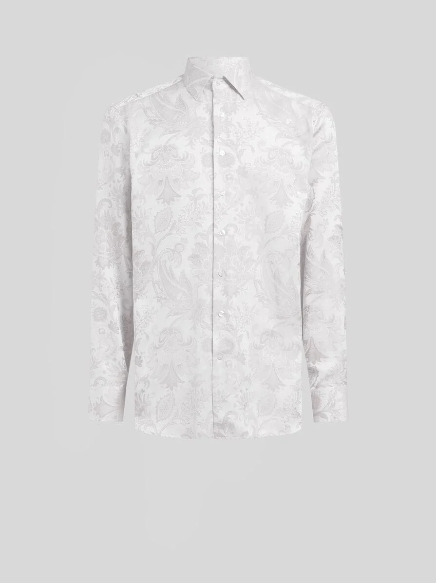 Pure cotton classic shirt with distinctive, all-over floral jacquard motif. • Roma regular fit • Pointed collar • Long sleeves • Double-buttoned working cuffs • Made in Italy • The model is 6' 1½" (187 cm) tall and wears a size 39 PRODUCT DETAILS • 100% cotton