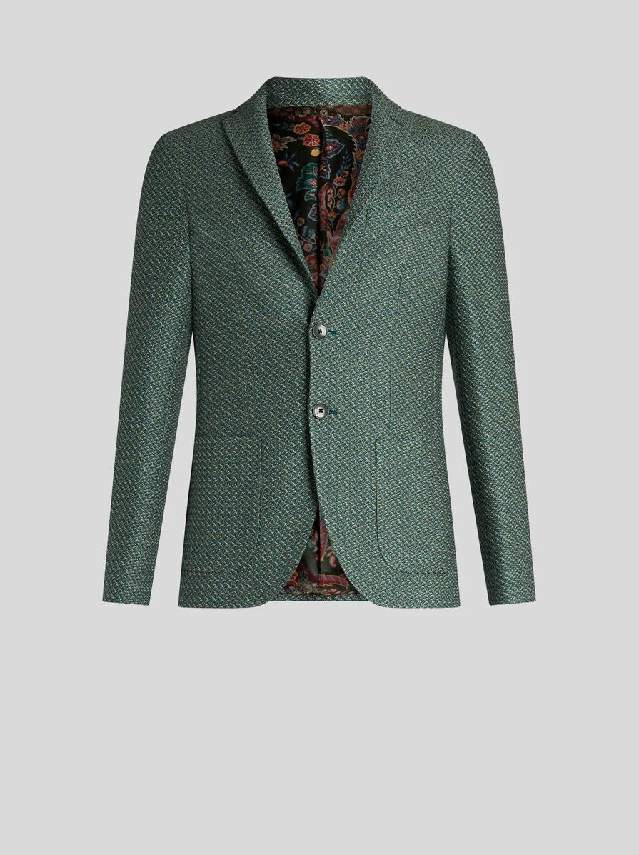 Single-breasted blazer made from woven multicoloured jersey yarn. This model features a contrasting undercollar with micro medallions and inner lining embellished with a multicoloured floral Paisley print. • Regular fit • Classic lapels • Single-breasted button closure • Welt breast pocket • Side slip pockets with flap • Corozo buttons • Working cuffs • Rear vents • Made in Italy • The model is 6’1”(186 cm) tall and wears a size 48 (IT) PRODUCT DETAILS • 100% cotton