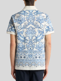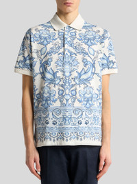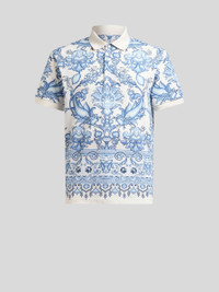 Pure cotton polo shirt with decorative, elegant and placed floral and geometric print inspired by majolica. The model is complete with a plain-coloured hem, sleeve ends and collar. • Regular fit • Pointed collar • Short sleeves • Made in Italy • The model is 6' 1½" (187 cm) tall and wears a size M PRODUCT DETAILS • 100% cotton