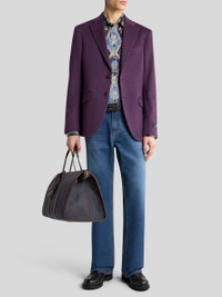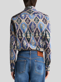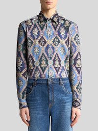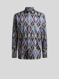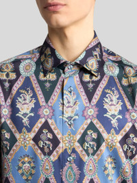 Cotton sateen shirt. This model features an all-over geometric- and floral-patterned print. • Roma regular fit • Pointed collar • Button closure • Double-buttoned working cuffs • Made in Italy • The model is 6' 1½" (187 cm) tall and wears a size 39 PRODUCT DETAILS • 100% cotton