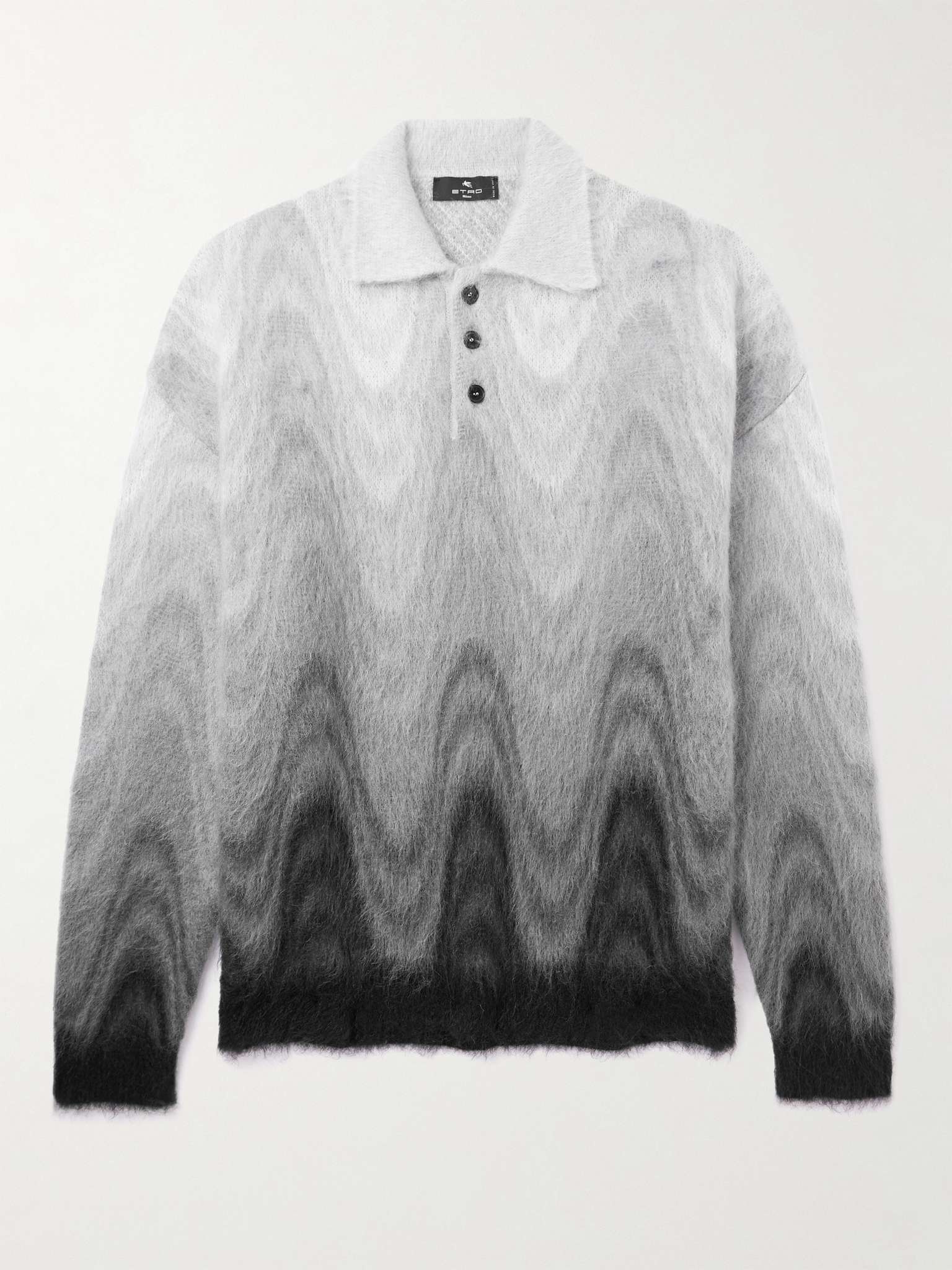 Etro's shirt has been made in Italy from fuzzy mohair and is patterned with waves that fade from white at the pointed polo collar down to solid black along the cuffs and hem. It's warm yet lightweight, making it perfect for those in-between days. Size & Fit - Fits true to size. Take your normal size - Designed for a loose fit - Weighted knit - Model is shown wearing a M - Model measures: chest 38"/ 96cm, height 6'2"/ 188cm Details & Care - White, tonal-grey and black mohair - Button fastenings - 100% mohair - Dry clean
