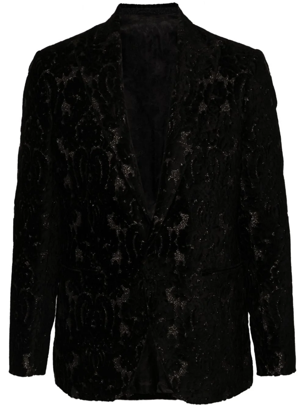 devore-effect single-breasted blazer Highlights - Black - Devore effect - Metallic threading - Peak lapels - Long sleeves with faux buttoned cuffs - Chest welt pocket - Dart detailing - Two front jetted pockets - Straight hem - English rear vents - Multiple internal slip pockets - Full logo-jacquard lining - Fabric-covered buttons - Front button fastening Made in Italy Composition Outer: Viscose 62%, Cotton 32%, Polyamide 6% Lining: Viscose 100% SIZE & FIT Model measurements Height 6 ft 2 in(1.88 m) Bust/Chest 36.61 in(93 cm) Hips 35.82 in(91 cm) Waist 27.95 in(71 cm) FittingInformation Designed for a slim fit, offering a comfortable fit that sits just away from the body The internal shoulder pads offer a structured shape Made from a midweight non-stretch fabric This piece fits true to size – take your usual size
