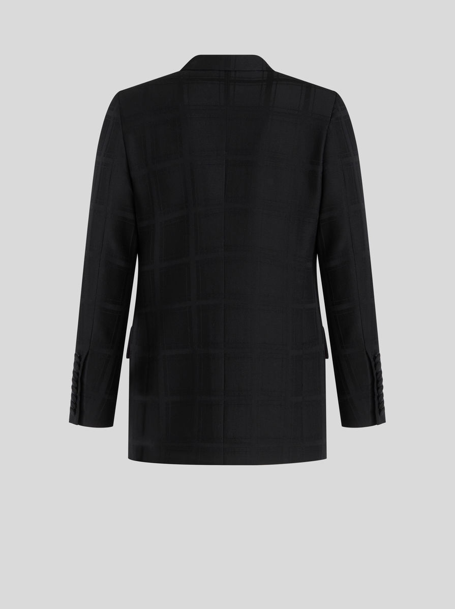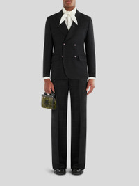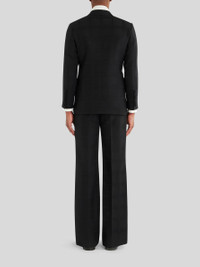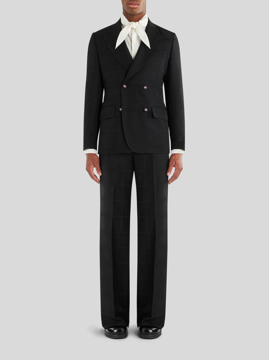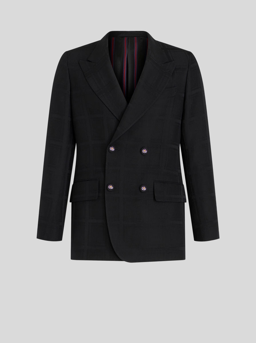 Double-breasted virgin wool jacket from the Men's Fall-Winter 2023 Fashion Show collection, decorated by a ton-sur-ton check pattern and embroidered buttons with micro flowers. Inside, the jacket has a striped ETRO jacquard lining. PRODUCT DETAILS • Exterior: 100% virgin wool • Lining: 52% viscose, 48% acetate • Comfort fit • Double-breasted fastening • Peak lapels • Fabric-covered buttons with embroidery • Piped breast pocket • Front patch pockets • Piped inside pockets • Rear slits • Made in Italy • The model is 188 cm / 74,01 inches tall and wears size 48