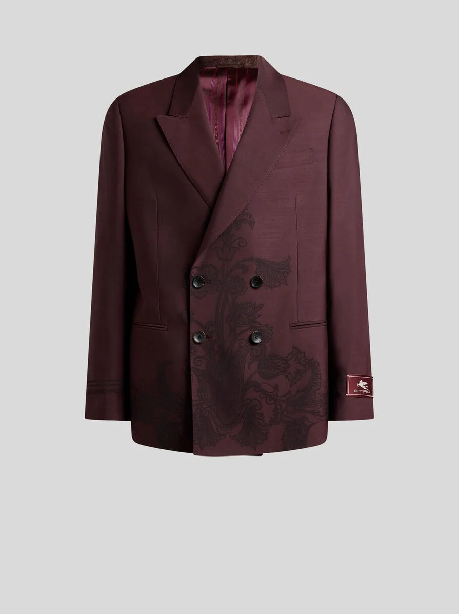 Double-breasted pure wool jacket with placed floral motif. This model is finished with a contrasting undercollar and a tailor's label featuring the Pegaso symbol and ETRO logo on the sleeve. • Regular fit • Peak lapels • Double-breasted closure with buttons • Welt pockets at the front • Made in Italy • The model is 6' 1" (186 cm) tall and wears a size 48 PRODUCT DETAILS • 100% wool • Lining: 52% viscose, 48% acetate