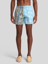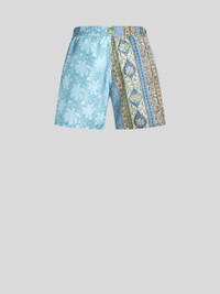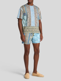 Technical fabric swim shorts with all-over double print. This model is embellished with a patch bearing the Pegaso symbol and the ETRO monogram embroidered on the back. • Roma regular fit • Elasticated waist • Side slip pockets • Drawstring with logo-branded tips • Made in Italy • The model is 6' 1½" (187 cm) tall and wears a size M PRODUCT DETAILS • 100% polyester