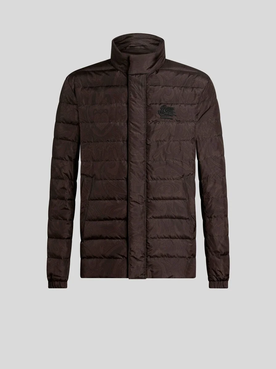 Padded, stripe-quilted nylon down jacket with decorative Paisley print all over. This model is embellished with an embroidered Pegaso symbol and ETRO logo on the chest. • Regular fit • Fastened with press studs and two-way zip • Welt side slip pockets • Made in Hungary • The model is 6’1”(186 cm) tall and wears a size M PRODUCT DETAILS • Exterior: 100% polyester • Lining: 100% polyester • Goose down padding: 85% down, 15% feathers