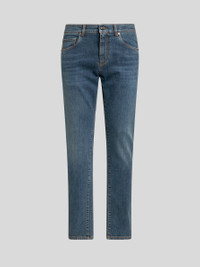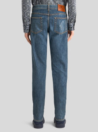 Slim-fit five-pocket jeans. This stretch cotton denim model is embellished with Paisley embroidery on the back pocket. Completing the garment are, a metal button with raised Pegaso logo and label with Pegaso symbol and ETRO logo. • Regular fit • Five pockets • Concealed zip and Pegaso button closure • Made in Italy • The model is 6' 1½" (187 cm) tall and wears a size 32 PRODUCT DETAILS • 98% cotton, 2% elastane