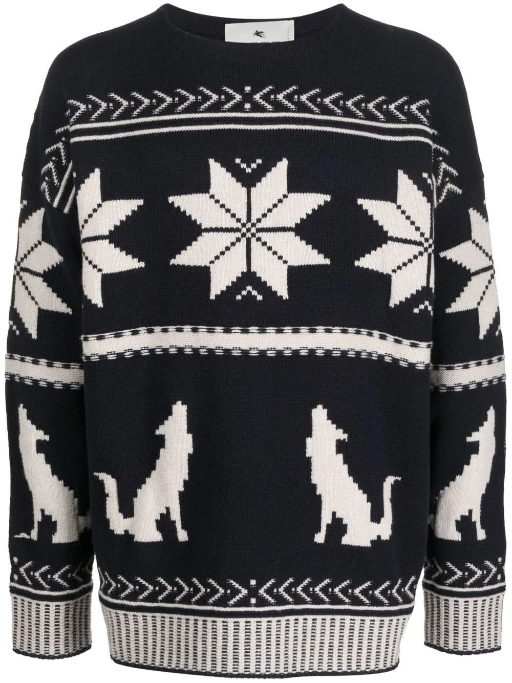 patterned-jacquard knitted jumper Highlights - Navy blue - Blue - Virgin wool - Chunky knit - Patterned jacquard - Crew neck - Long sleeves - Straight hem Made in Italy Composition Virgin Wool 100% SIZE & FIT Model measurements Height 6 ft 1 in(1.86 m) Bust/Chest 36.61 in(93 cm) Hips 37 in(94 cm) Waist 28.74 in(73 cm) FittingInformation This piece fits true to size. We recommend you get your regular size Cut for a relaxed fit Made with a mid-weight fabric