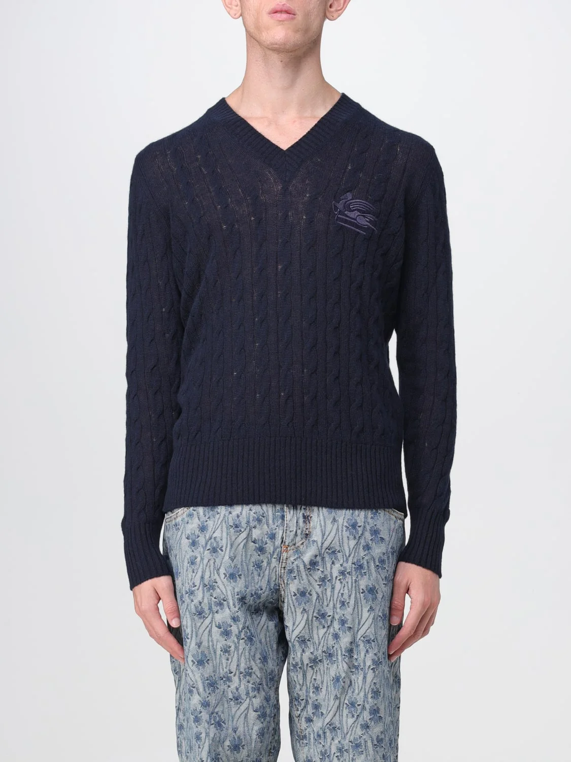 DESCRIPTION - Style: Classic - Logo: Embroidered - Neckline: V neckline - Shoulders: Regular - Sleeves: Long - Cuffs: Ribbed - Bottom: With straight hemline - Materials: Cashmere - Pattern: Logo DETAILS AND CARE Composition 100% cashemere Wash and Care Dry clean SIZE AND FIT Sizes not available Size and fit Slim fit Designer code: 1N9929680 200 Giglio Code: E84649 Designer: Etro Collection: Etro Men Category: Clothing Etro