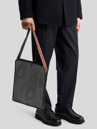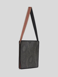 Medium-size bag in iconic Paisley jacquard fabric, with flat design and leather details. This accessory is perfect to carry on the shoulder thanks to the practical, striped ribbon shoulder strap. • Dimensions (Width, Height, Depth): 11.8 x 14.2 x 1.6 inches (30 x 36 x 4 cm) • Press-stud fastening • Shoulder strap • Made in Italy PRODUCT DETAILS • Exterior: Paisley jacquard cotton fabric coated with matt texture and lined with canvas • Coating: 100% PVC • Details: calfskin • Black ribbon: 100% cotton • Shoulder strap: 95% polyester, 5% polyamide • Lining: 100% cotton