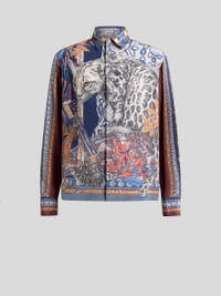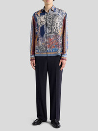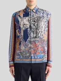 Relaxed-fit long-sleeved shirt in pure silk fabric. This piece stands out for its placed print depicting a neutral-coloured leopard alongside multicoloured floral and abstract elements. Completing the garment is a geometric motif featuring small shells along the sleeves and hem. • Easy fit • Pointed collar • Branded-button closure • Working cuffs • Made in Italy • The model is 6' 1" (186 cm) tall and wears a size M PRODUCT DETAILS • 100% silk