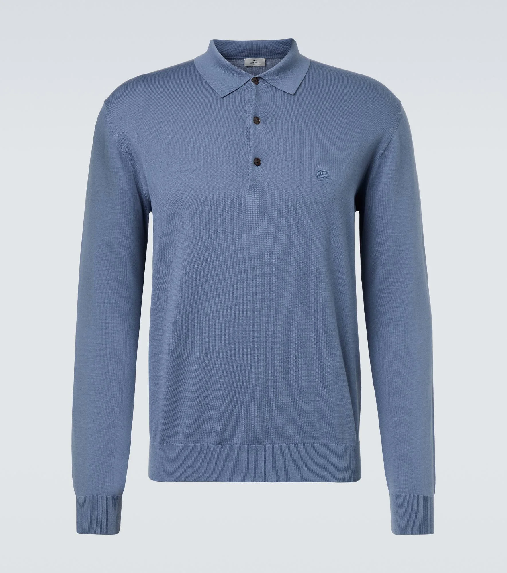 This elegant polo sweater from Etro is perfect for minimalists everywhere. Made from pure cotton, the piece has a classic fit, collar, and three-button placket. Product Details - Material: 100% cotton - Care instructions: hand wash - Made in China - Color: blue - Designer color name: Air Force Blue - Collar: polo collar - Closure: partially buttoned front - Hem: ribbed - Cuff: ribbed - Item number: P01135101 Size & Fit - True to size - Straight fit - Stretchy fabric - Falls to the hip - Height of model is 189cm-74.5" and wears a size L
