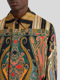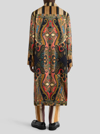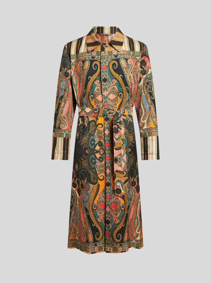 Overcoat with multicoloured Paisley print all over. The collar, top part and sleeve ends are embellished with distinctive vertical stripes in the same colour palette. Inner lining embellished with printed vertical stripes of varying width. Completing the garment is a handy waist belt with the same pattern. • Regular fit • Shirt collar • Concealed closure with first button visible • Matching waist belt • Made in Italy • The model is 6' 1½" (187 cm) tall and wears a size M PRODUCT DETAILS • 100% viscose • Lining: 52% viscose, 48% acetate