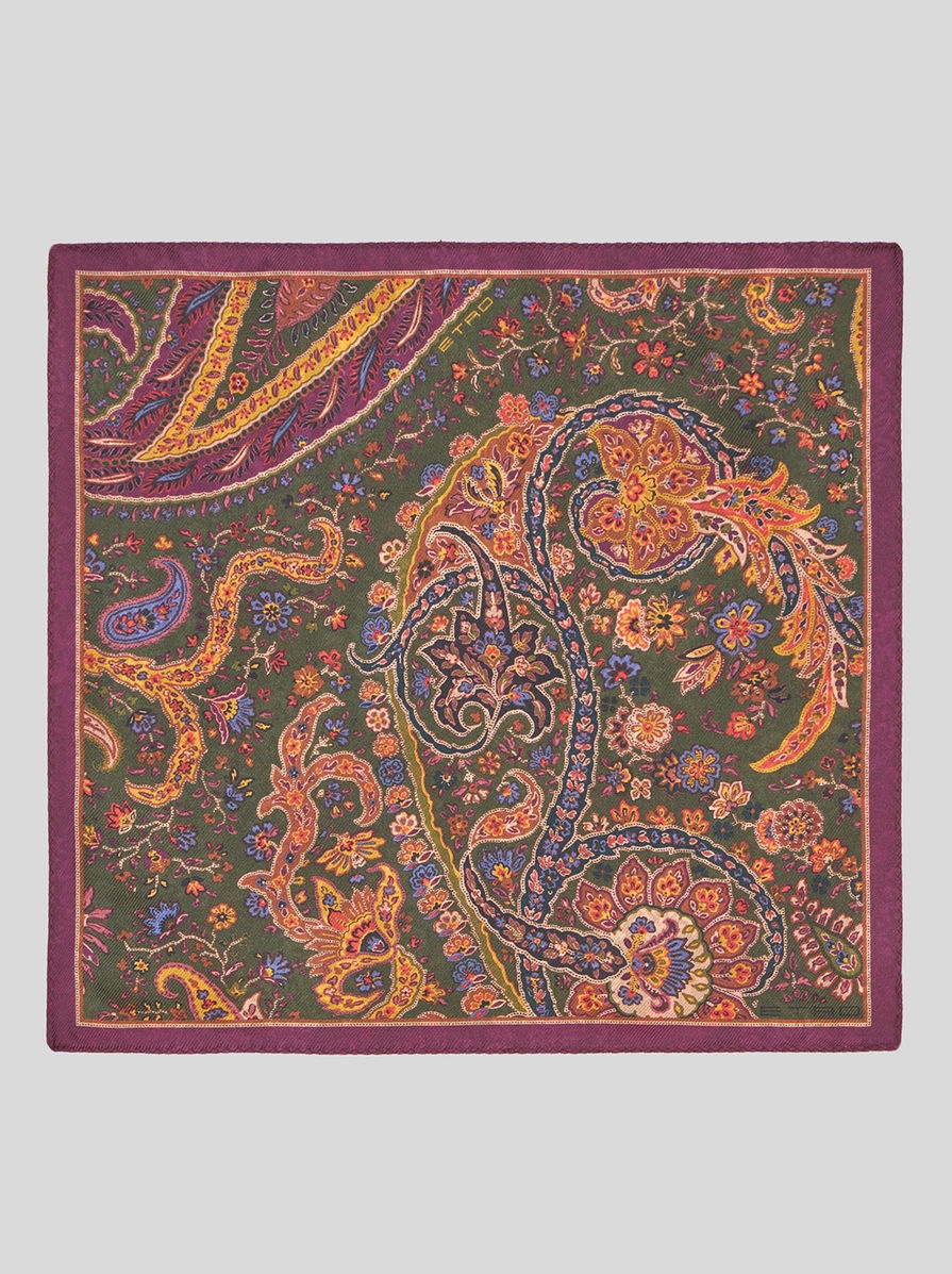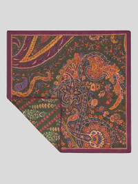 Silk pocket square. One side is embellished with a floral Paisley print while the other features a decorative foliage print. Contrasting edges. PRODUCT DETAILS • 12.99 x 12.99 inches (33 x 33 cm) • 100% silk • Made in Italy
