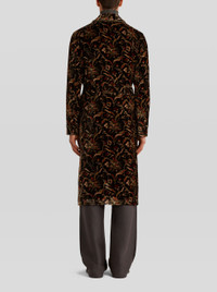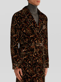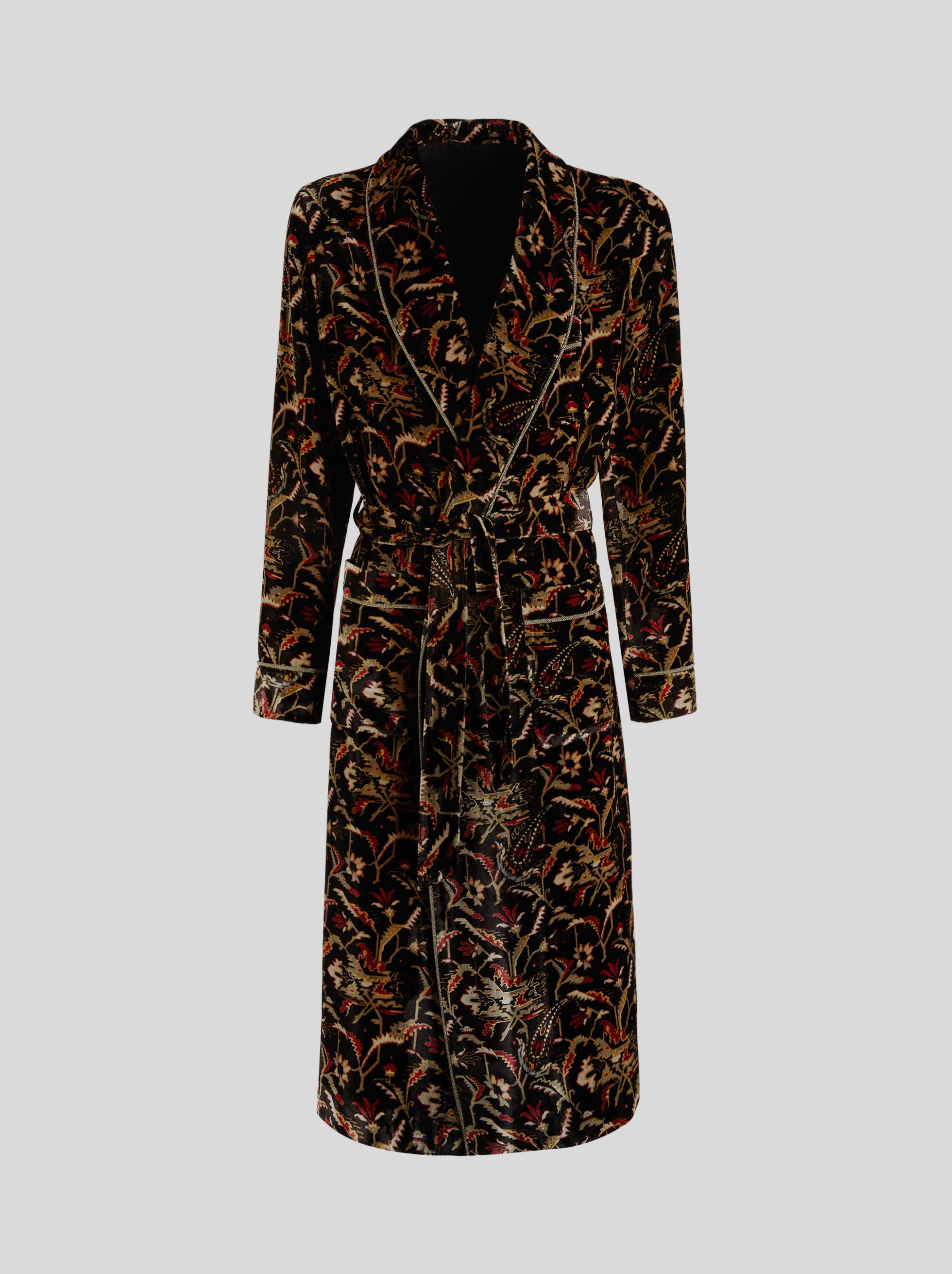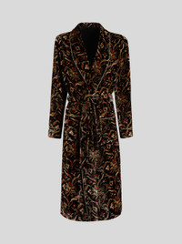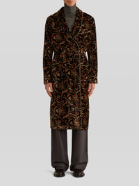 Robe styled coat in velvet from the Men's Fall Winter 2022 Fashion Show collection, decorated with a floral print, embellished by contrasting piping finishes. PRODUCT DETAILS • 82% viscose, 18% silk • Lining: 100% silk • Sleeves: 100% viscose • Oversize • Detachable belt • Patch pockets • Made in Italy • The model is 188 cm tall and wears size 48 Sku: 222U1C36255050001
